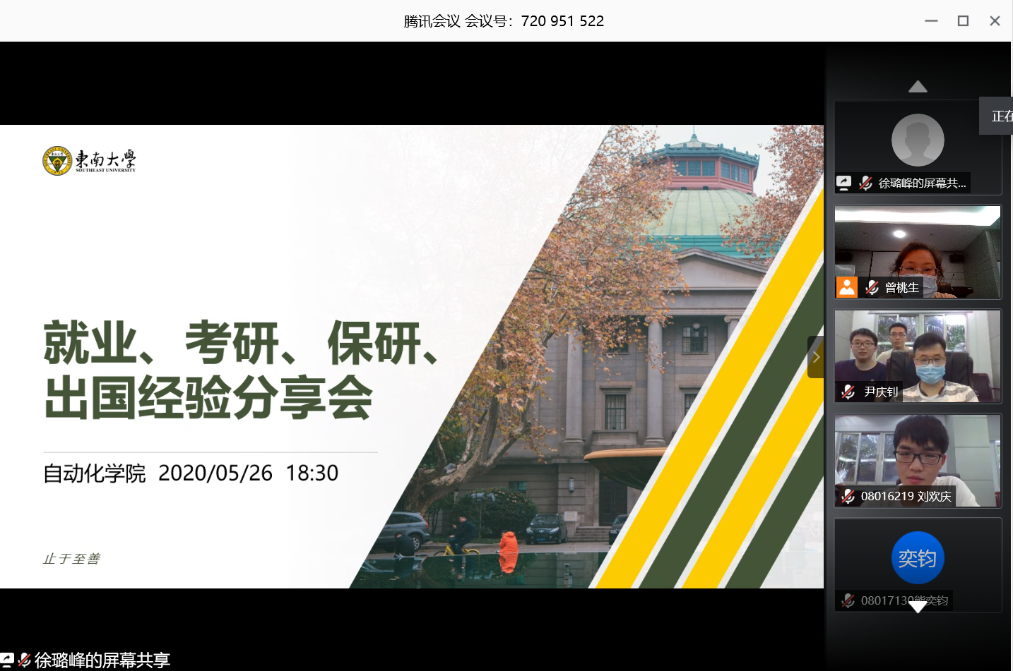 5月26日晚,我院召开本科毕业生就业经验线上分享会,邀请了2016级本科毕业生曹森淼、尹庆钊、徐璐峰、刘欢庆、王星等五位同学,面向低年级学生进行就业、保研、考研经验分享。学院负责国际交流的王辰星老师也在会上分享了关于本科期间出国交流项目的相关事项。会议由大四辅导员曾桃生老师主持。