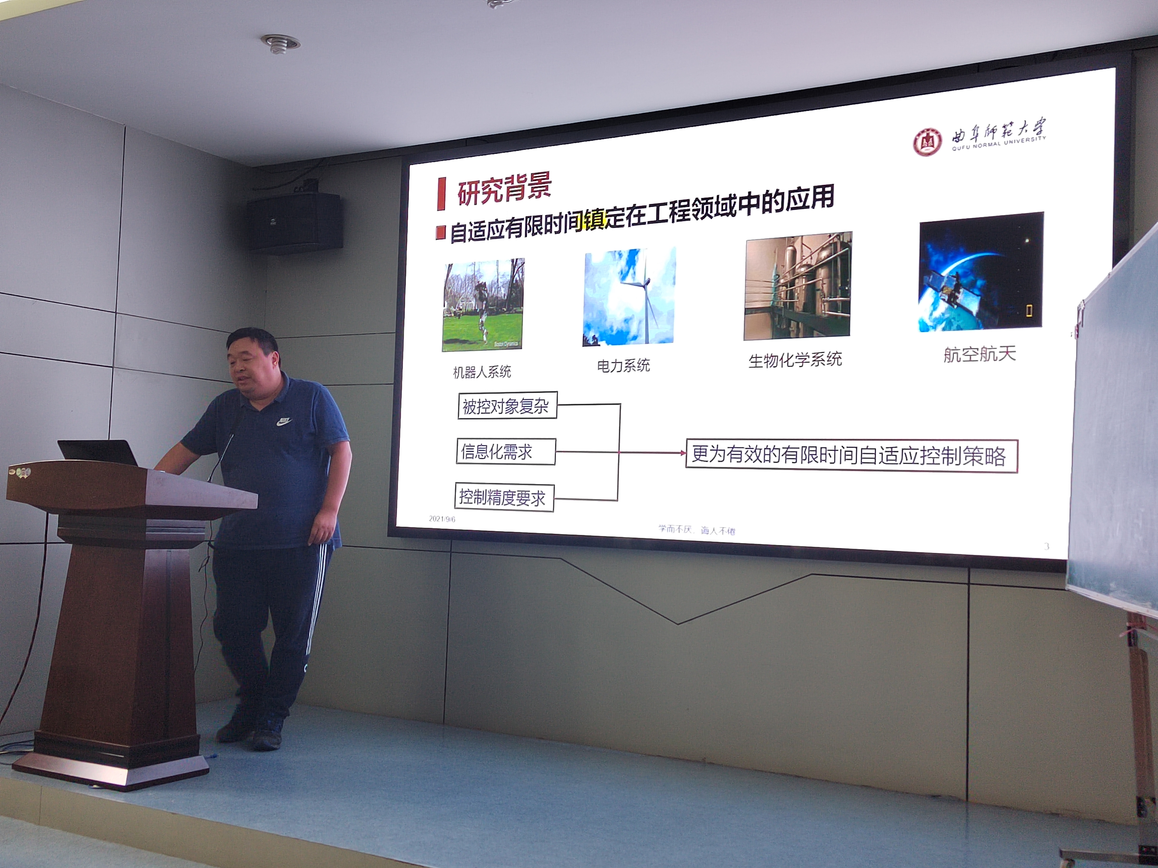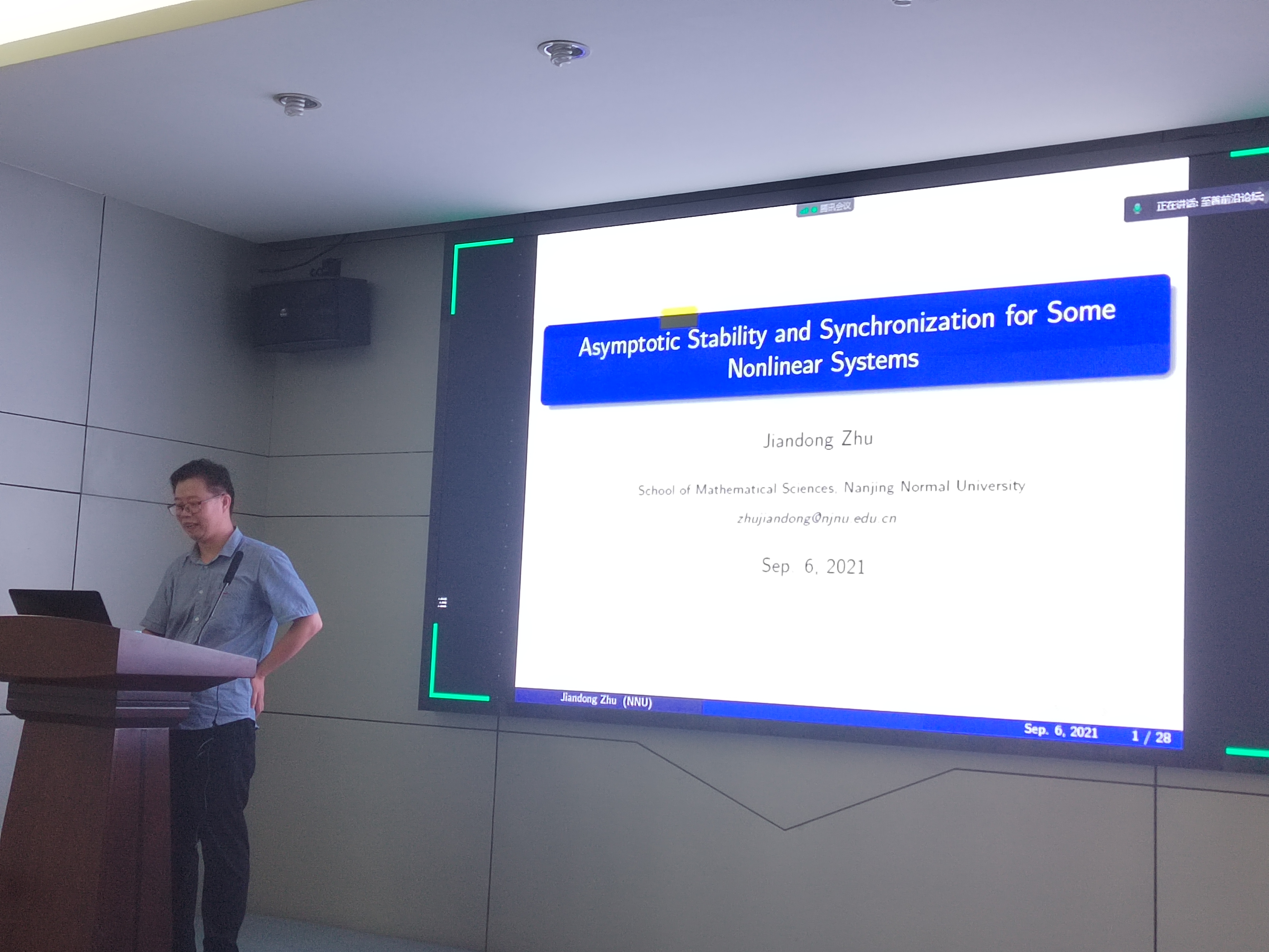 接下来作报告的是曲阜师范大学孙宗耀教授,报告研究了一类有严重不确定性且通讯受约束的高阶非线性系统的全局有限时间自适应镇定问题,提出了一种由明显的触发规则和一个时变界限构成的触发机制,与传统事件触发方法不同的是,提出的逻辑能够避免搜寻所有触发间隔的下界,并用一个仿真算例来说明提出方案的有效性和优越性。