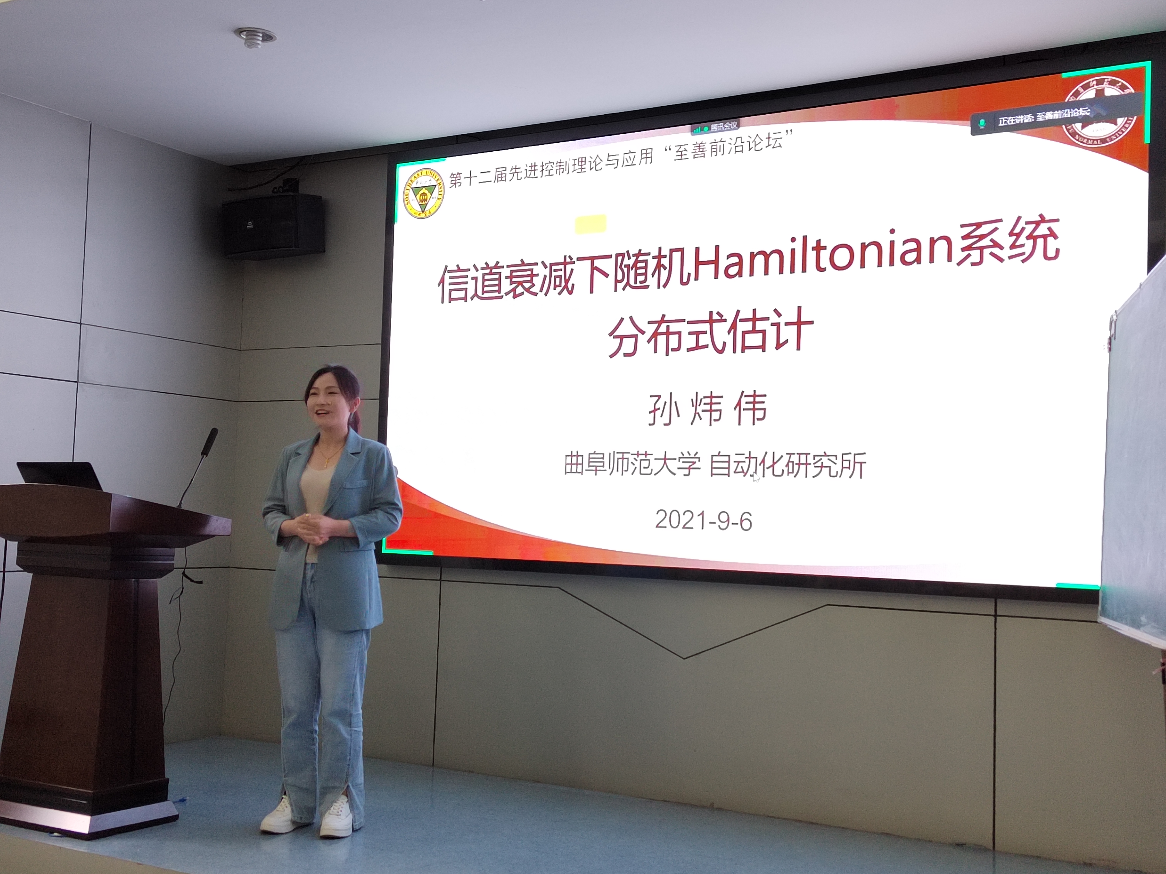 在论坛的第四场报告中,曲阜师范大学孙炜伟教授作了“信道衰减下随机Hamiltonian系统的分布式估计”的报告,报告围绕网络环境下Hamiltonian系统的估计与控制,介绍已有研究揭示的困难和问题,介绍了近期在随Hamiltonian系统的分布式估计取得的部分进展,展示仿真实验结果,并提出几点思考。