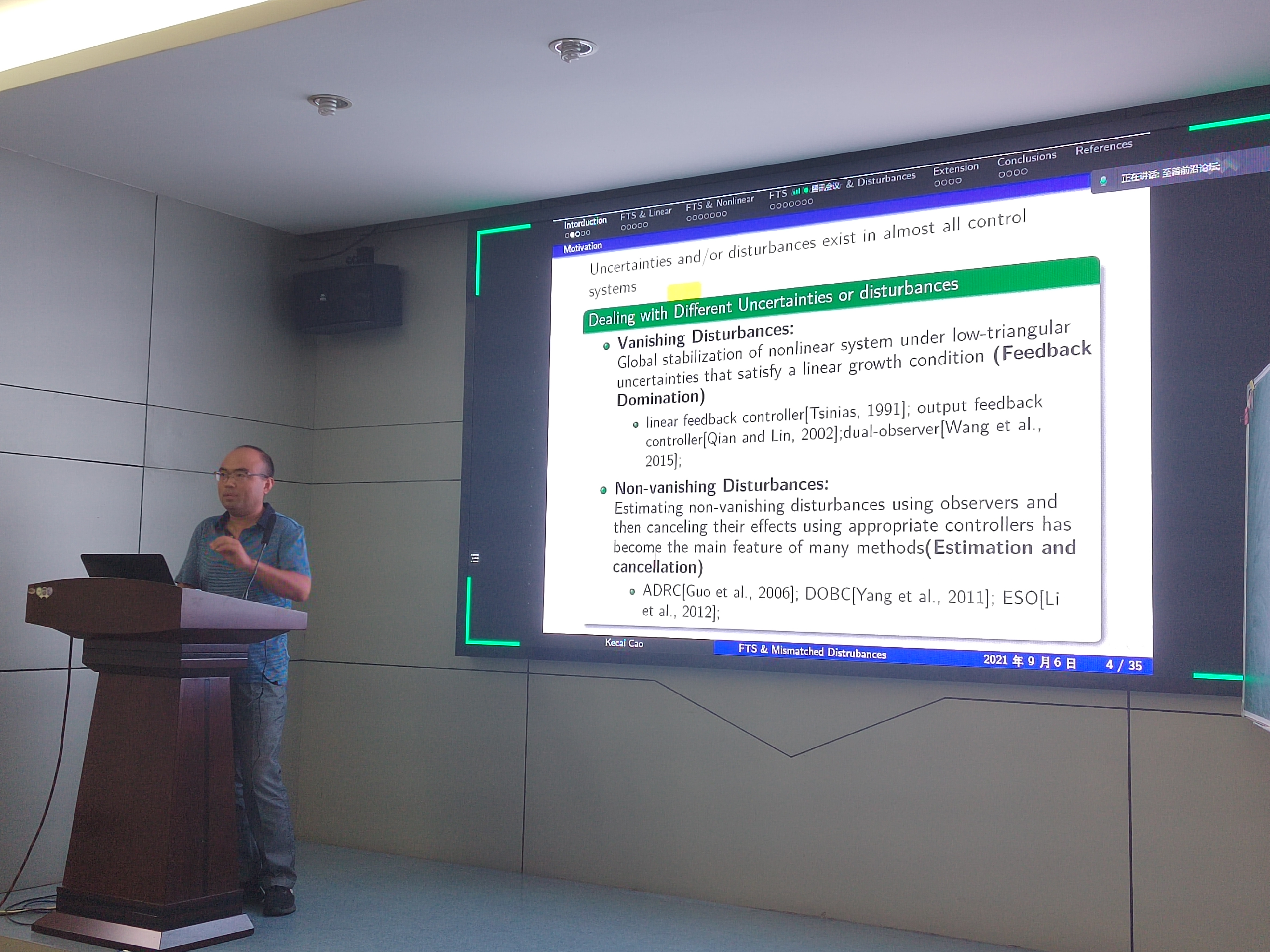接下来作报告的是南京工程学院曹科才教授,报告的题目是“Finite-time Integral Controllers for a Class of Planar Nonlinear Systems with Mismatched Disturbances”,报告介绍了一类含有不匹配扰动的非线性系统的全局有限时间镇定问题的研究。该研究首先构造非线性积分动态对扰动进行补偿,对于有限时间收敛问题,利用系统状态巧妙地构造了新的控制器,仿真研究表明该控制器具有良好的控制性能。