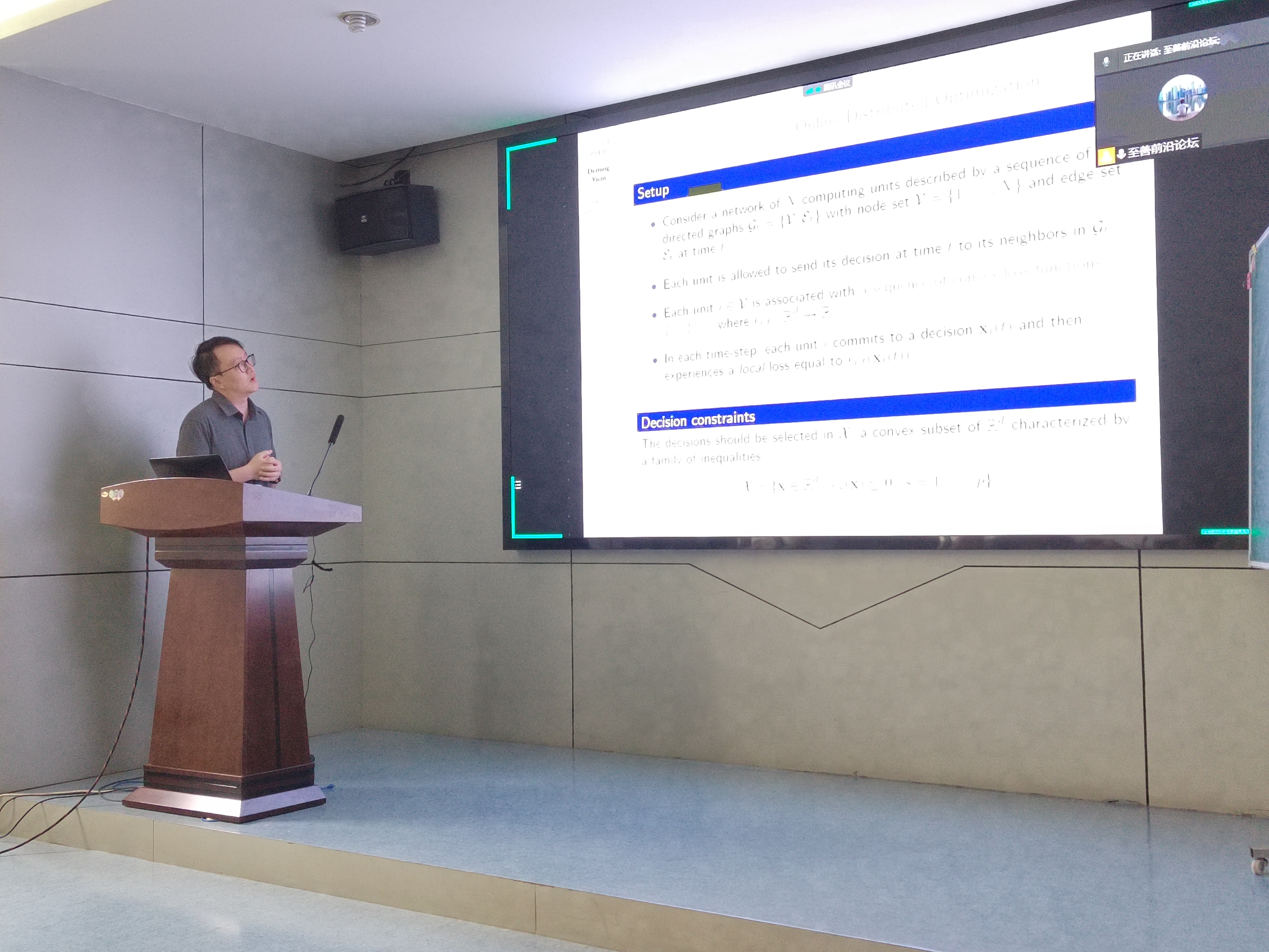 在论坛的第二场报告中,南京理工大学袁德明教授作了“Distributed Online Convex Optimization with Long-Term Constraints”的报告,该报告重点介绍了具有时变拓扑结构的分布式在线凸优化问题。报告介绍了一种具有遗憾度次线性增长和违反度累加的分布式优化算法,并通过仿真实例展示了该算法对时变拓扑的鲁棒性。