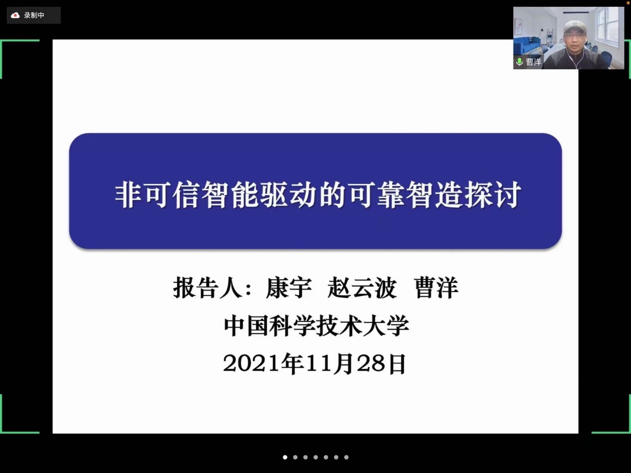 在论坛的第二场报告中,中国科学技术大学曹洋教授代表康宇教授作了题为“非可信智能驱动的可靠智造探讨”的报告。