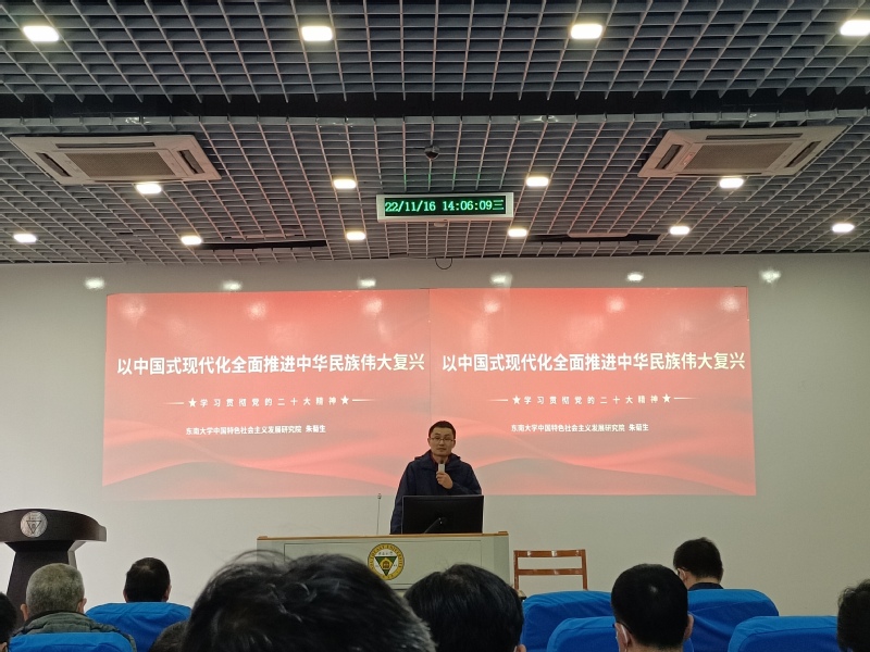 会上,朱教授以“以中国式现代化全面推进中华民族伟大复兴”为主题,从党的二十大的重大意义、报告概览、过去5年的工作和新时代10年的伟大变革、开辟马克思主义中国化时代化新境界、新时代新征程中国共产党的使命任务、全面建设社会主义现代化国家的重大部署、以党的自我革命引领社会革命等7个方面,对党的二十大精神进行了系统且全面深入地解读。