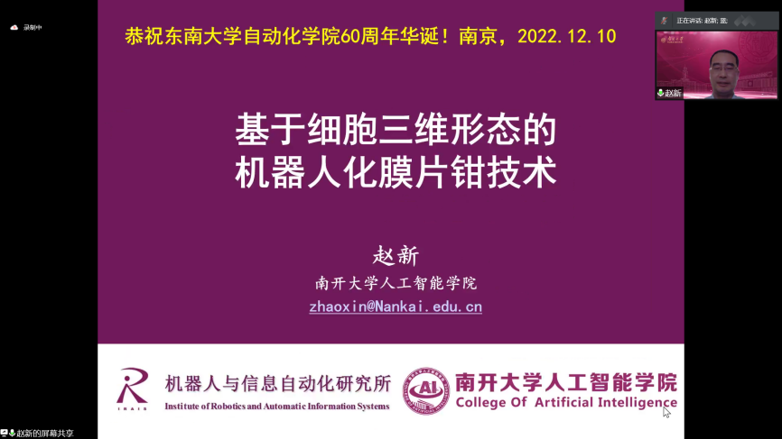 接下来作报告的是南开大学人工智能学院院长赵新教授,他首先指出膜片钳技术急需突破的五大挑战,提出了面向脑科学研究的机器人化主动膜片钳系统,随后就动物主动固定与跟踪技术、膜片钳电极内荧光染料流速控制技术、三维重建与精准定位技术等多项关键技术做了具体介绍。