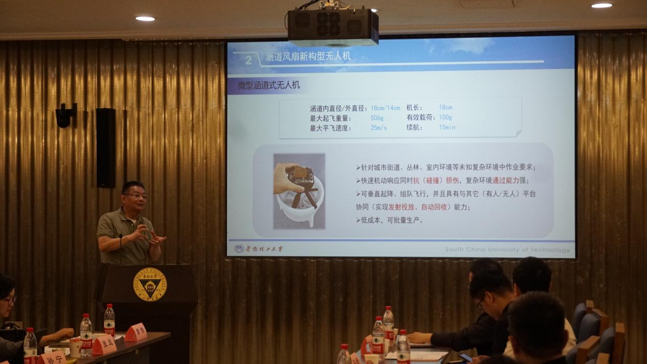 在上午的第三场报告中,华南理工大学裴海龙教授作了题为“新构型涵道风扇无人机系统”的报告。涵道风扇动力系统具有独特的构型,近年来随着人们对其气动特性的进一步认识以及新型控制算法的发展,其飞行器设计部分再次得到广泛关注。报告首先介绍了涵道风扇构型的气动特性和控制特点的研究进展,然后探讨了基于涵道风扇的几种新构型无人机设计、航迹规划和飞行控制,最后介绍了正在进行的VTOL涵道风扇飞行器设计应用。