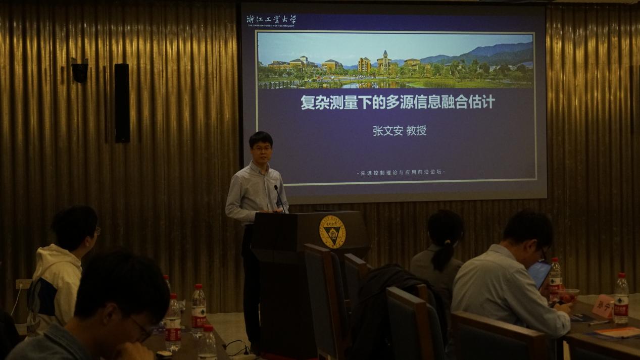 在下午的第五场报告中,浙江工业大学张文安教授就“复杂测量下的多源信息融合估计”进行了报告。报告首先介绍了感知信息从单一数据需求向多源超高清、超高速数据和跨网络深度融合需求的转变趋势。其次阐述了由于感知信息高维和不确定性,经典信息融合理论中的信息同步和完备性要求难以满足而产生的关键难点,并对此提出了有效的处理方法。