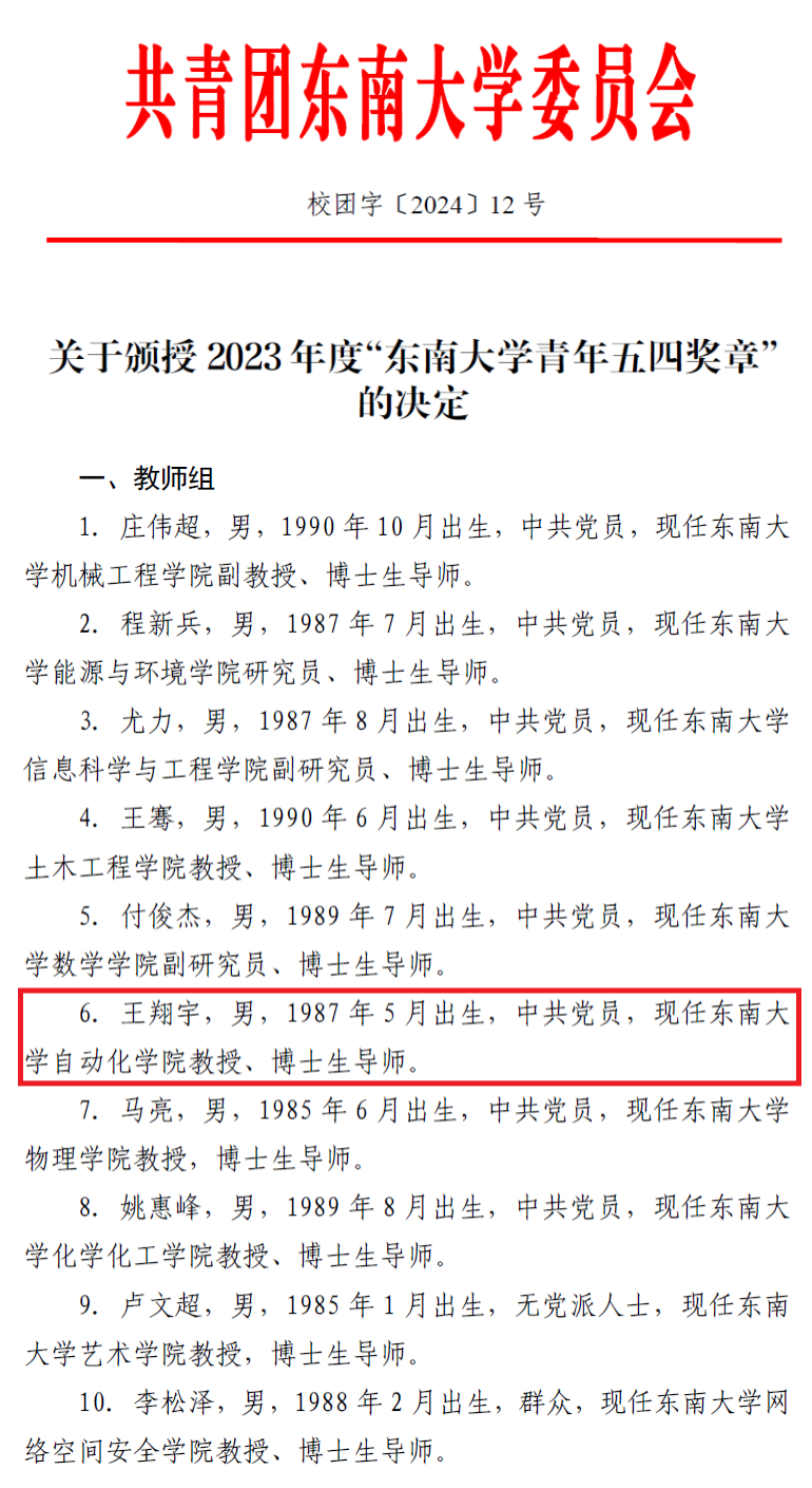 “beat365正版唯一官方网站青年五四奖章”是共青团beat365正版唯一官方网站委员会授予东大青年的最高荣誉,旨在树立政治进步、品德高尚、贡献突出的优秀青年典型,反映东大青年的精神品格和价值追求。我院王翔宇教授荣获2023年度“beat365正版唯一官方网站青年五四奖章”。