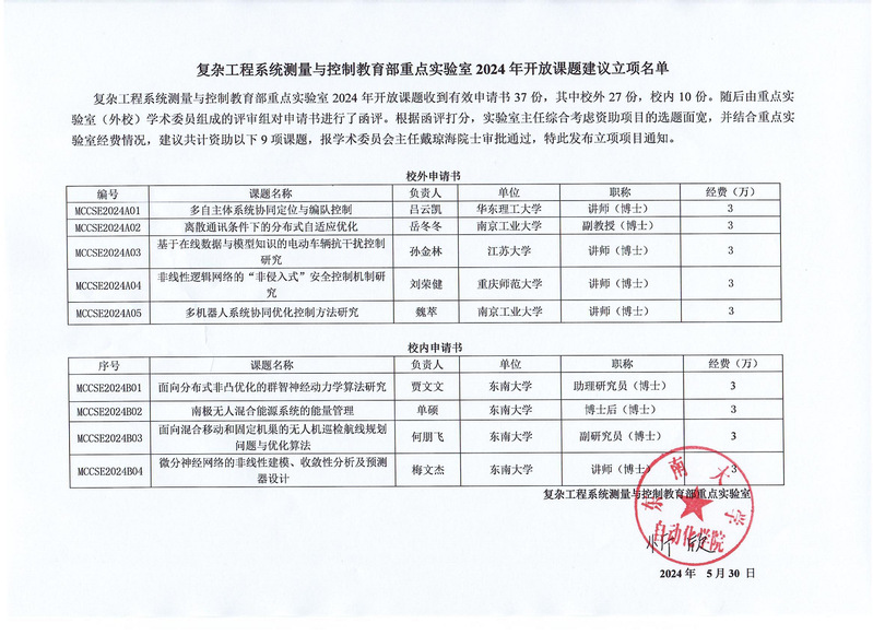 复杂工程系统测量与控制教育部重点实验室2024年开放课题收到有效申请书37份,其中校外27份,校内10份。随后由重点实验室(外校)学术委员组成的评审组对申请书进行了函评。根据函评打分,实验室主任综合考虑资助项目的选题面宽,并结合重点实验室经费情况,建议共计资助以下9项课题,报学术委员会主任戴琼海院士审批通过,特此发布立项项目通知。