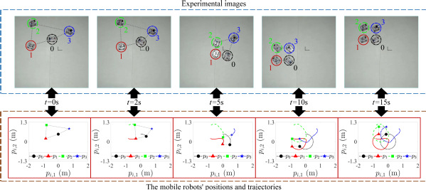 实验图像和各移动机器人在不同时刻的位置、轨迹