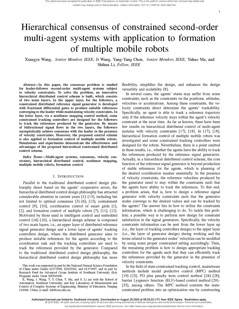 近日,beat365正版唯一官方网站机电系统控制实验室(MSCL)李世华教授、王翔宇教授团队的研究论文“Hierarchical Consensus of Constrained Second-Order Multi-Agent Systems With Application to Formation of Multiple Mobile Robots”(受限二阶多智能体系统的分层一致性及其在多移动机器人编队中的应用)以长文(Full Paper)形式录用在控制领域两大顶刊之一的《IEEE Transactions on Automatic Control》(IEEE TAC)上。这是团队在非线性协同控制与优化方向继2020年IEEE TAC长文和2024年Automatica长文之后第3篇在控制领域两大顶刊上录用的长文。该论文提出了一种新颖的受限多智能体系统分层协同控制方案。beat365正版唯一官方网站王翔宇教授为论文的第一作者,李世华教授为通信作者。beat365正版唯一官方网站为论文的第一作者单位和通信作者单位。该研究得到了国家自然科学基金等项目的资助。