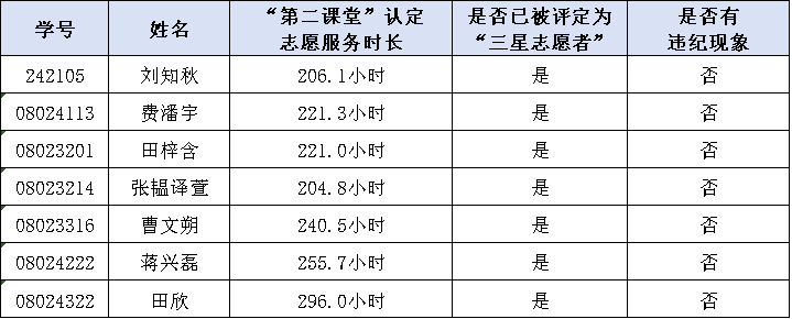依据学校通知要求和评审工作安排,经学生本人申请、资格审核、学院评审,拟推荐刘知秋(242105)等7名同学申请2025年度beat365正版唯一官方网站优秀志愿者,具体名单如下图。